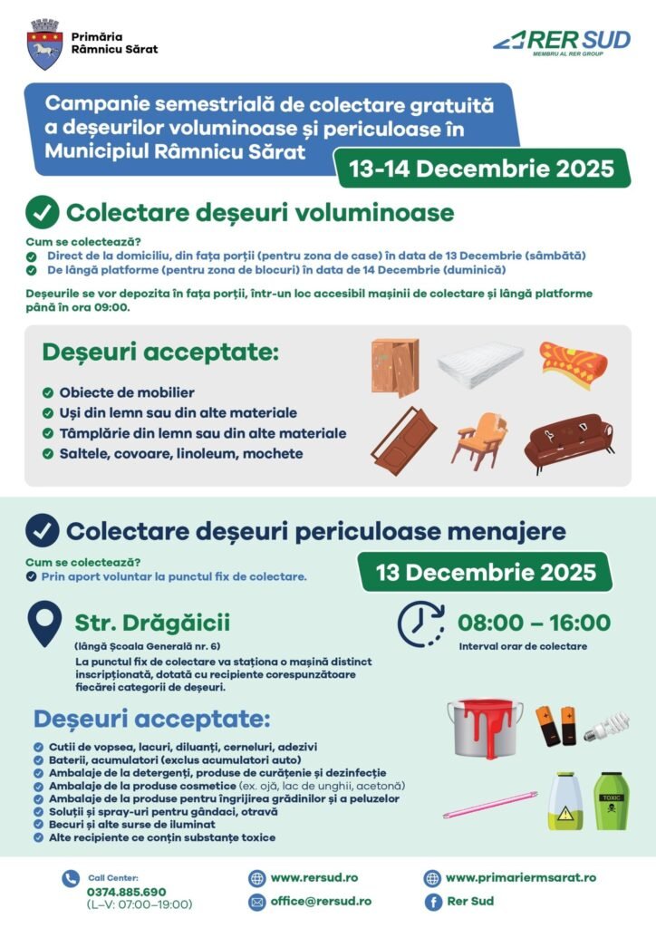 Râmnicenii pot preda deșeurile periculoase doar în data de 13 decembrie 2025 la un punct fix, temporar amenajat, unde va staționa în intervalul orar 08.00 -16:00 o mașină distinct inscripționată, dotată cu recipiente coerespunzătoare pentru fiecare categorie de deșeu. Locația unde va staționa mașina este: Str. Drăgăicii (lângă Școala nr. 6).