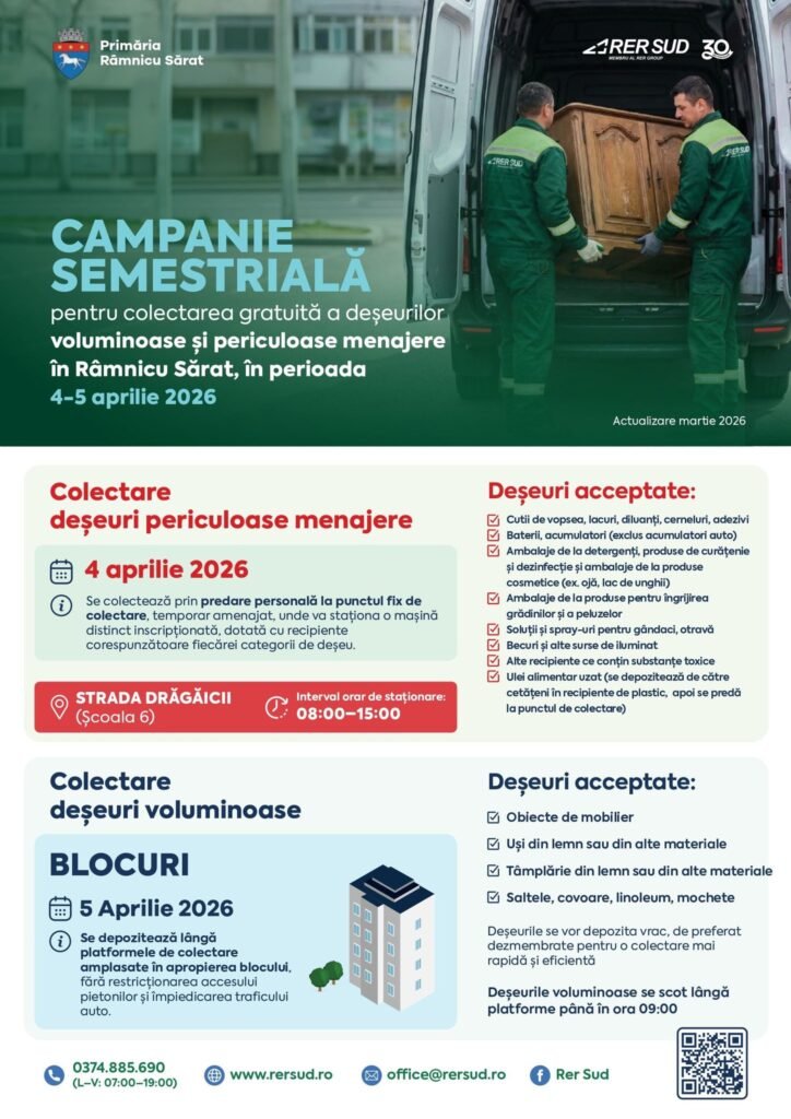 RER SUD, în calitate de unic operator de salubrizare de pe raza municipiului Râmnicu Sărat organizează împreună cu Primăria Râmnicu Sărat în perioada 4-5 aprilie prima campanie din anul 2026 dedicată colectării GRATUITE a deșeurilor voluminoase și periculoase menajere generate de populație.