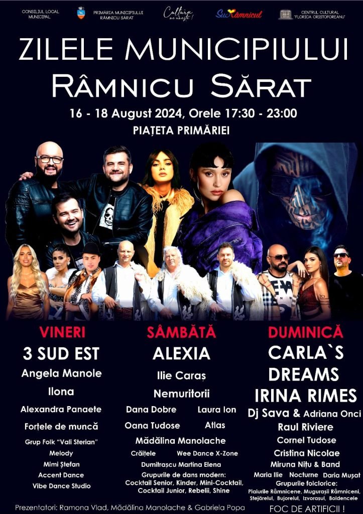 Primăria Municipiului Râmnicu Sărat și Centrul Cultural ,,Florica Cristoforeanu organizează în perioada 16 – 18 august 2024 Zilele Municipiului Râmnicu Sărat.